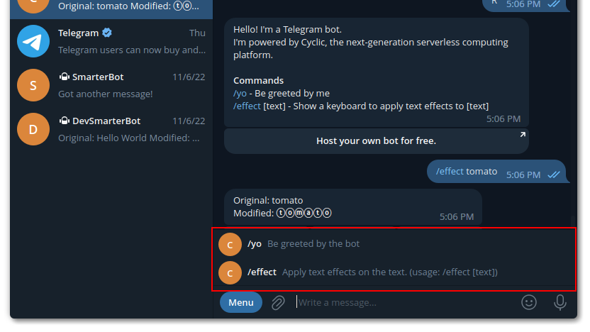 Test it out by sending the /start message to your bot. Note that your program is automatically updated once you modify the bot script.